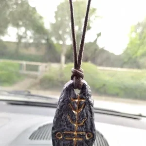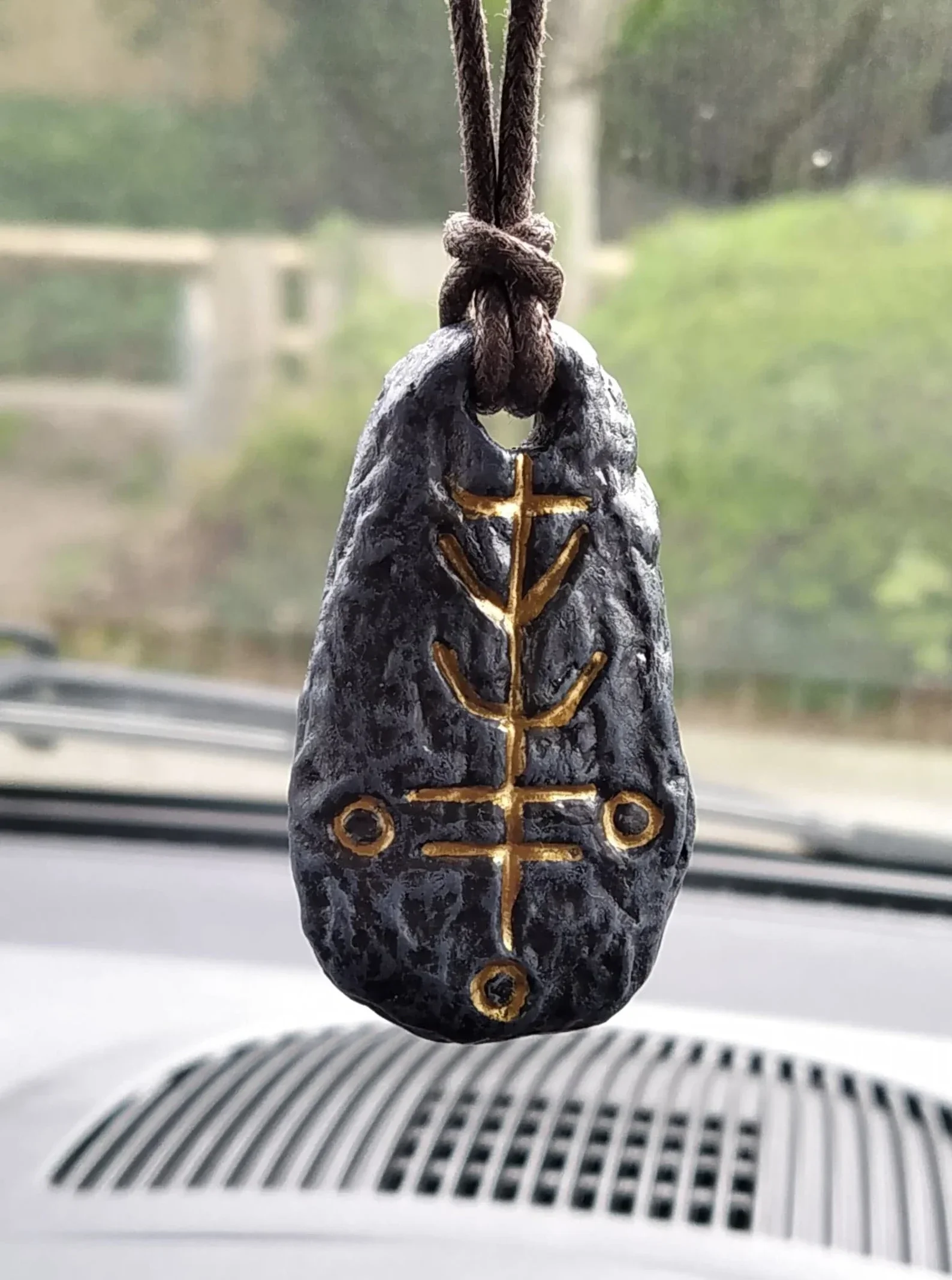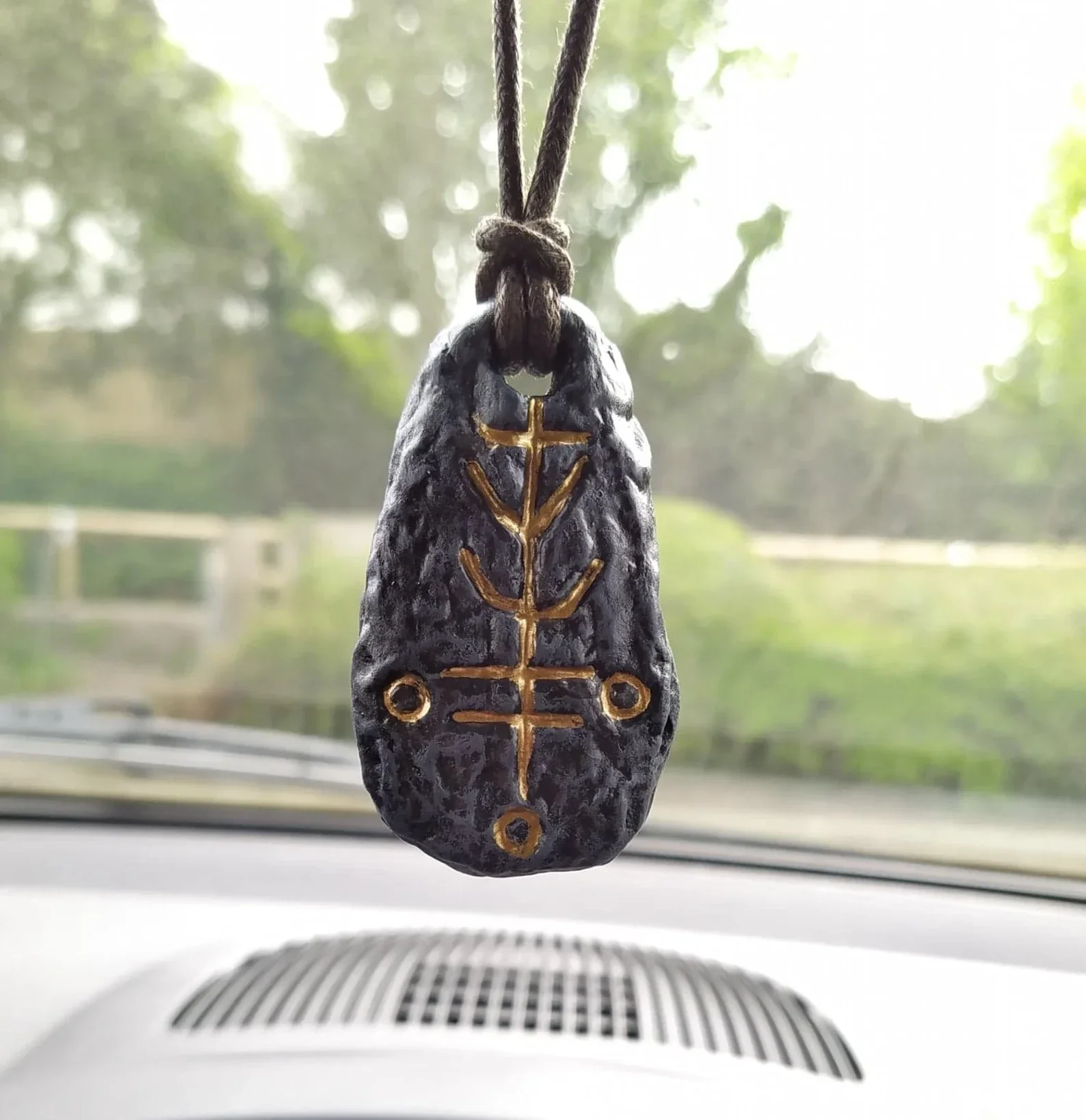 Viking Bind rune 'LUCK WILL FOLLOW' rear view car mirror charm, this unusual rear view mirror charm has been designed, sculpted and produced in concrete and then hand painted to give a rustic look. It has a thick brown wax cotton cord, the cord has an adjustable sliding knot so you can hang at your desired length.