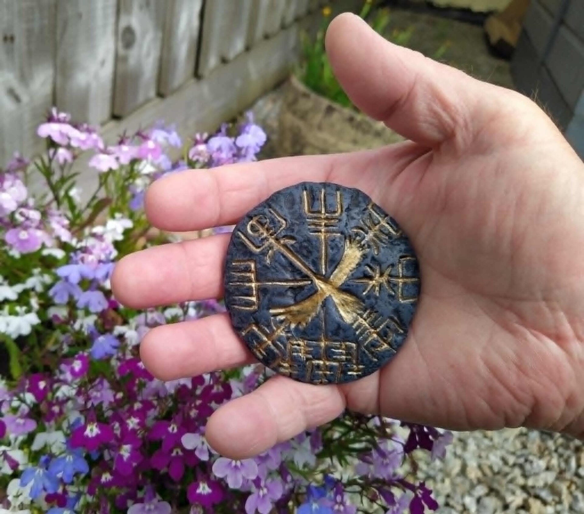Viking Vegvisir Compass symbol stone with crow in the middle, these attractive stones are designed, sculpted, produced and hand painted here in Cornwall, they are produced from reconstituted stone and painted with weatherproof paints in a rustic effect with gold paint. These stones now comes with a metal hook on the back so you can hang on a wall or fence.