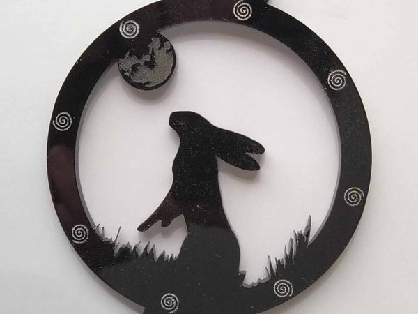 This gorgeous Moon Gazing Hare Car Charms are cut from piano black acrylic (apologies for the dust marks which show up in the pictures but not in real life) which stands out really well against the sky in either your car or home, you can hang from your rear view mirror or grab handles in your car or window handles in your home. The moon surface has been laser engraved and there are little spirals all around. The detailing is on both sides. There is a black feather attached and the charm is hung by black elastic cord, easy to hang over your mirror, you can easily tie a knot in the elastic if you would like the charm to hang closer to your mirror. If you would prefer black ribbon please message me and I can add that for you.