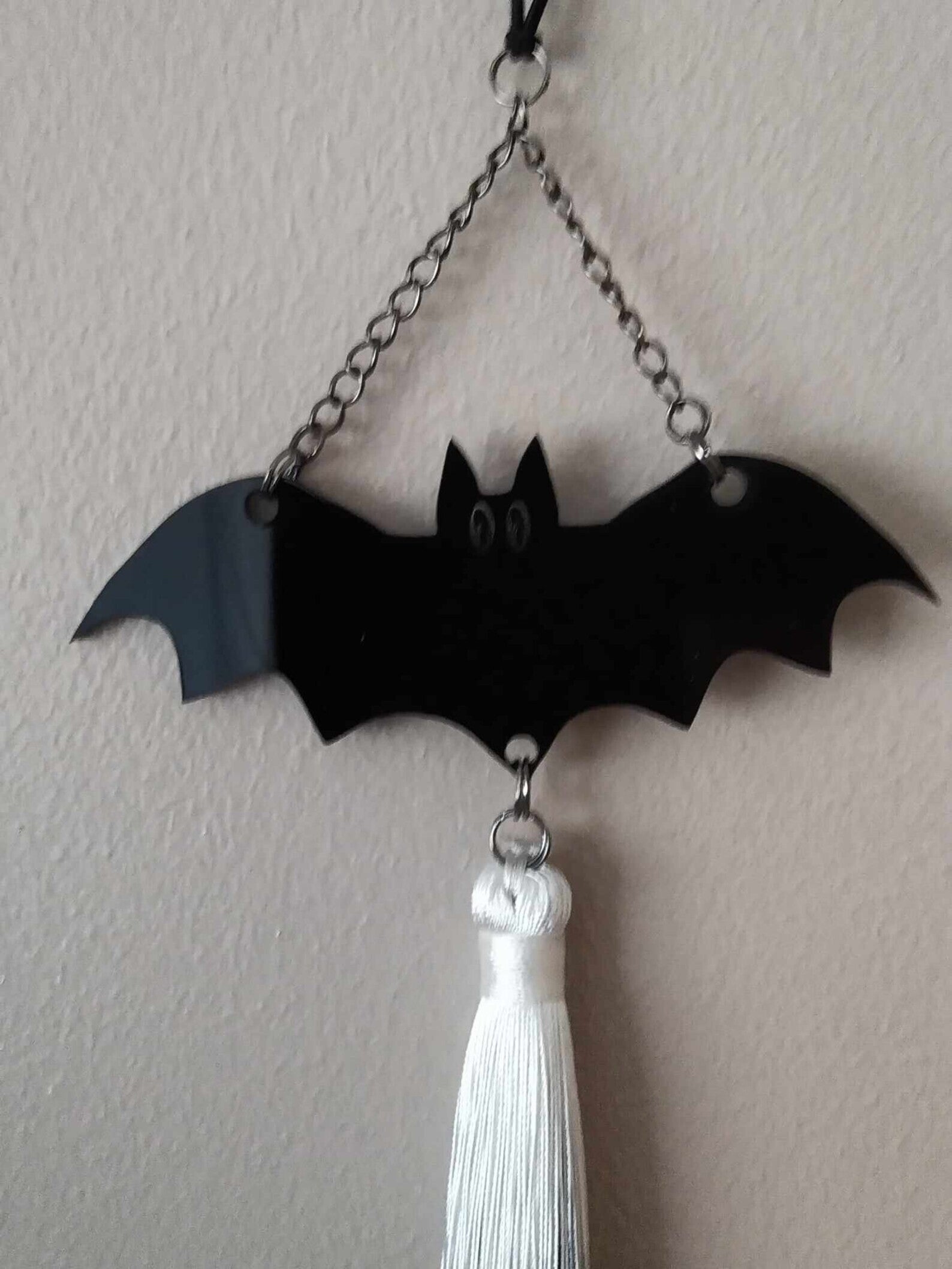 This stunning Bat hanger features a sleek black acrylic cut into a bat silhouette, complemented by a black-plated chain and an elastic loop—perfect for hanging over your rearview mirror. It's finished with an elegant Ombre tassel in shades of black, grey, and white, crafted from silky nylon..