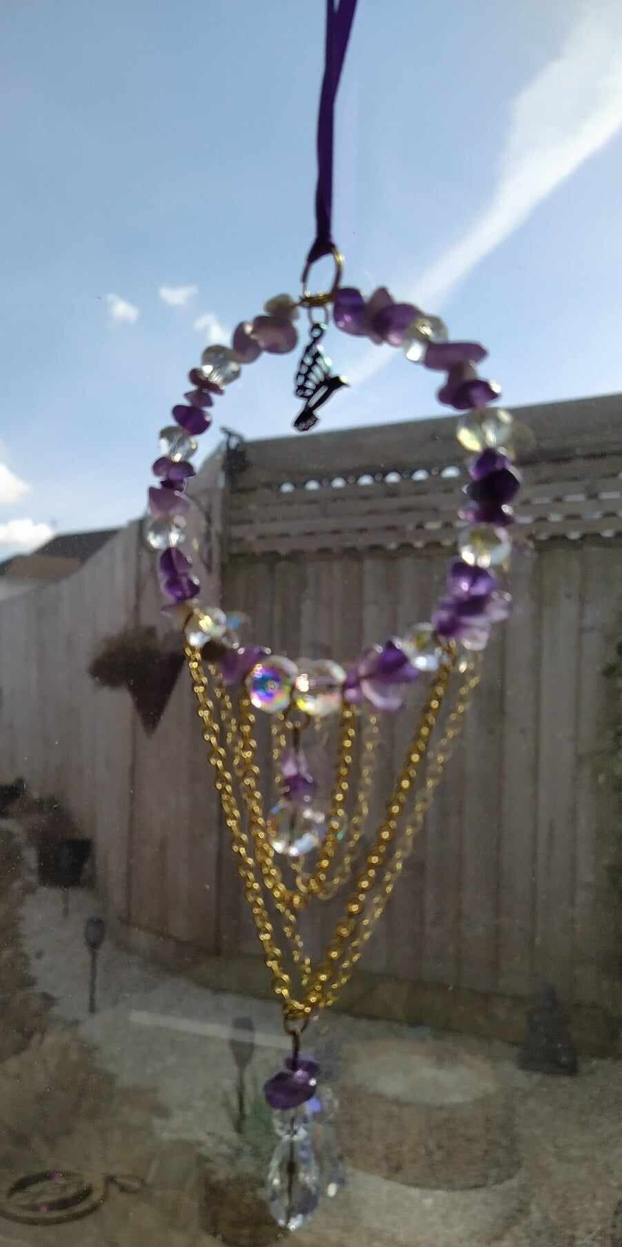 Brighten up your home with our pretty Hummingbird and Amethyst Gemstone Suncatcher. Designed and handcrafted in Cornwall, this elegant piece features light-catchingand light reflecting crystal glass beads and beautiful Amethyst chip beads, 2 dangles of gold colour chain with more crystal and Amethyst beads and a gorgeous small hummingbird which has a beautiful rainbow effect. It's perfect as a thoughtful gift or a delightful addition to any room. Measures approximately [++++].