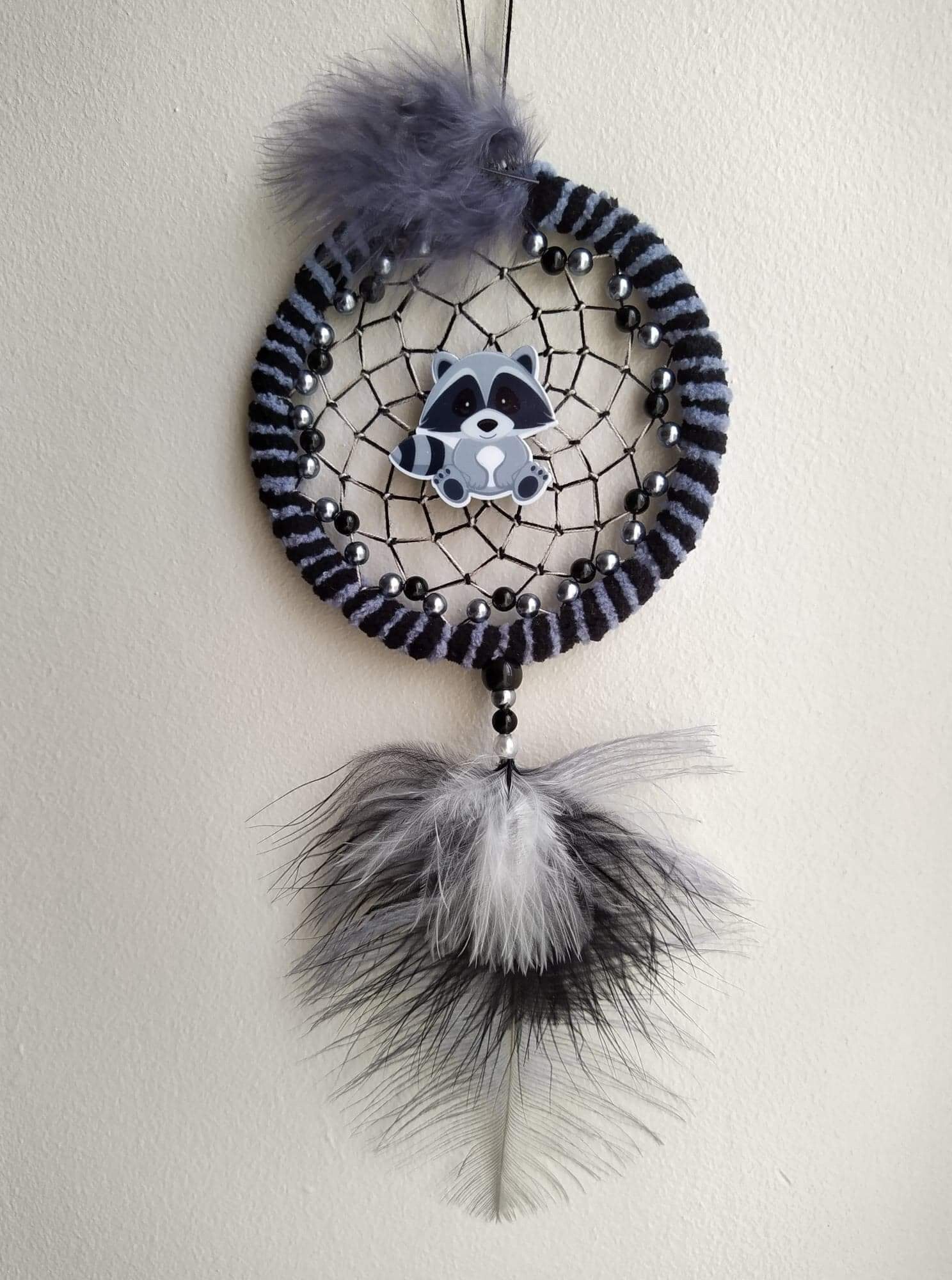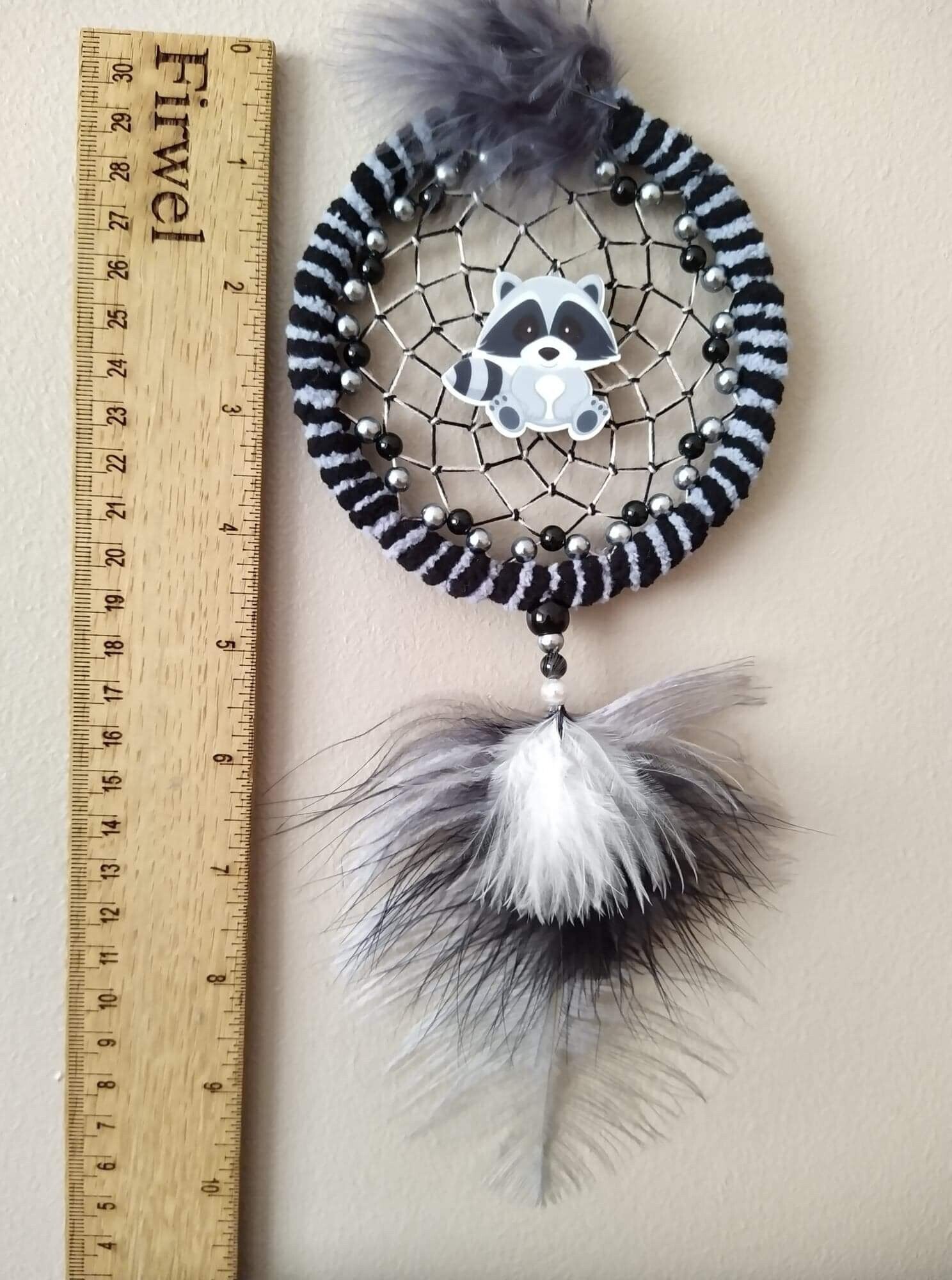 Cute Raccoon personalised dreamcatcher, with soft velvety black and grey hoop, grey/black double thread webbing with faux pearl grey beads, there is just one dangle which has a beautiful grey ostrich feather and a black and small white feather hanging from a large grey, black and white bead.. On the top of the hoop section there is a lovely grey fluffy feather and in the center is a gorgeous cute Raccoon.
