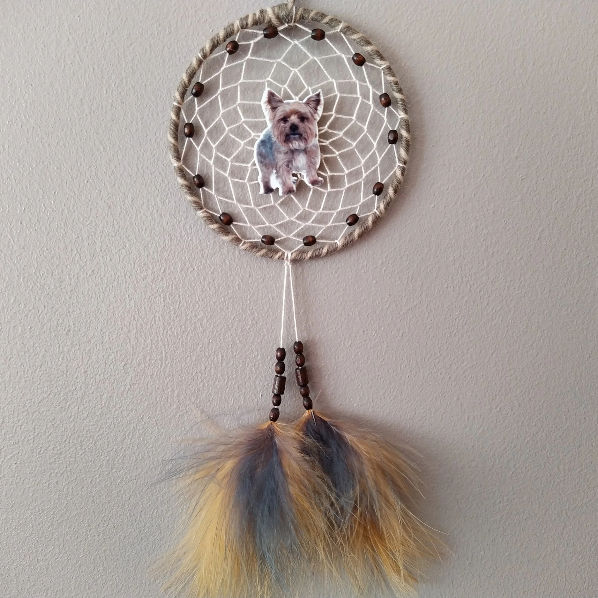 Yorkshire Terrier dog dreamcatcher, with beige hoop , intricate thread webbing and wooden oval beads, 2 dangles with more wooden beads and fluffy tan and grey feathers. In the middle is the gorgeous Yorkie resin charm.