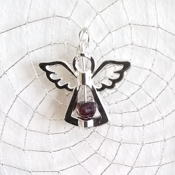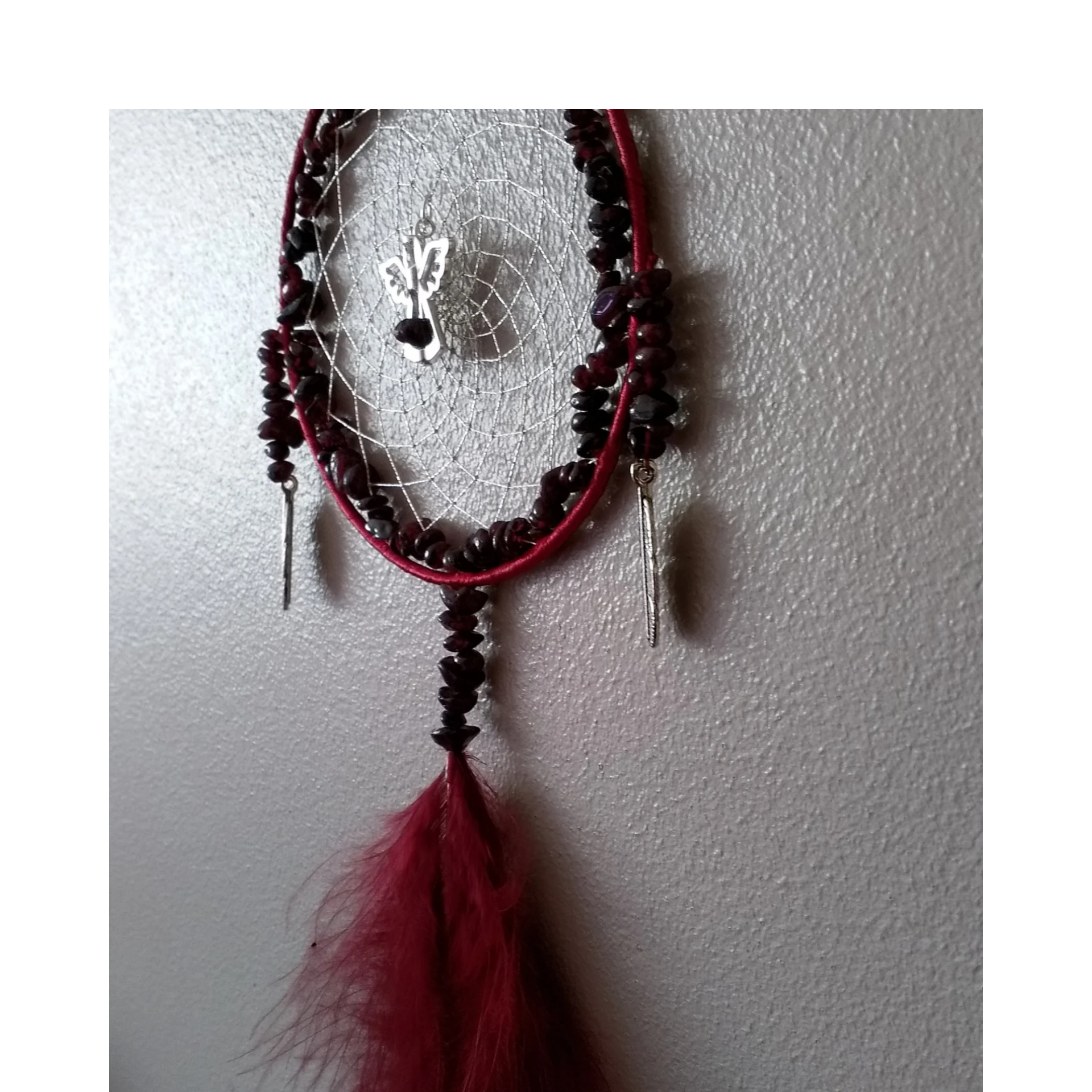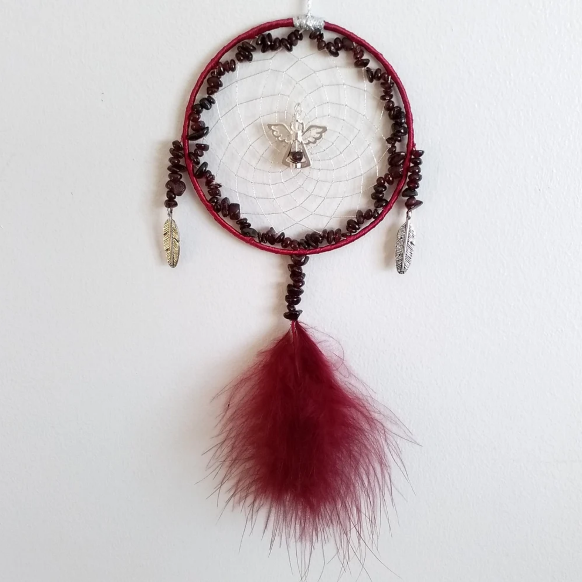 Each unique dreamcatcher has genuine Garnet chips in the intricate webbing, a cute little angel with the same Gemstone chips in her body, 2 angel feather dangles with more Gemstone chips and a fluffy feather on the middle dangle