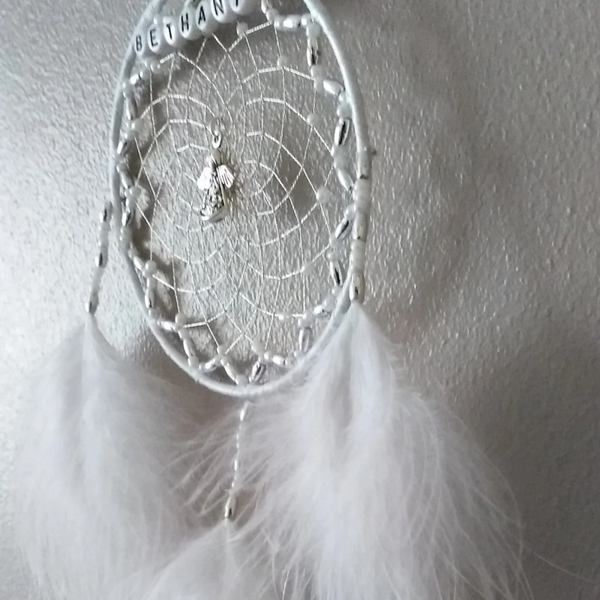 This white Guardian Angel Personalised Dreamcatcher has been lovingly hand crafted here in Cornwall UK this dream catcher measures 4" dia. (approx)