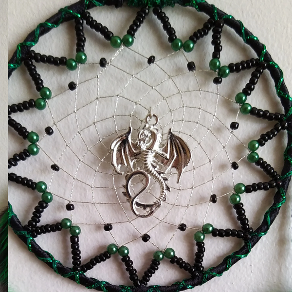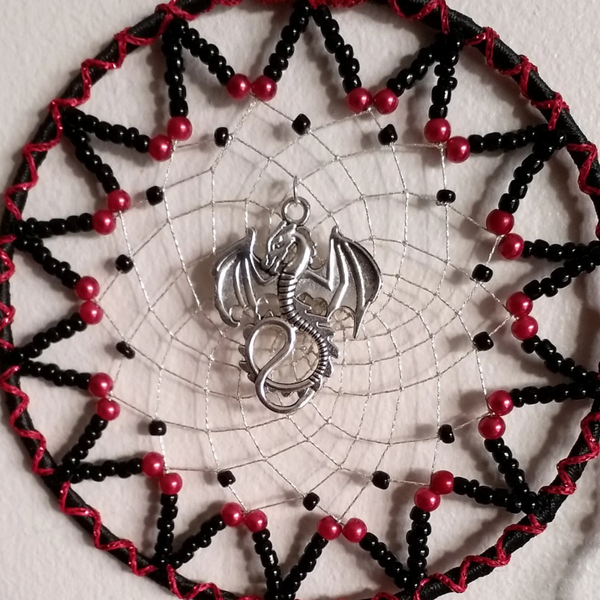 Dragon dreamcatcher, with red and black Green and black or blue and black hoop, faux pearl beads in a matching colour and black seed beads in the silver thread webbing, 3 beaded dangles each with a fluffy black and coloured feather. In the center is a gorgeous silvertone dragon. Available in several colours with black, if the option you require is showing as out of stock, please contact me as I may be able to make you one.