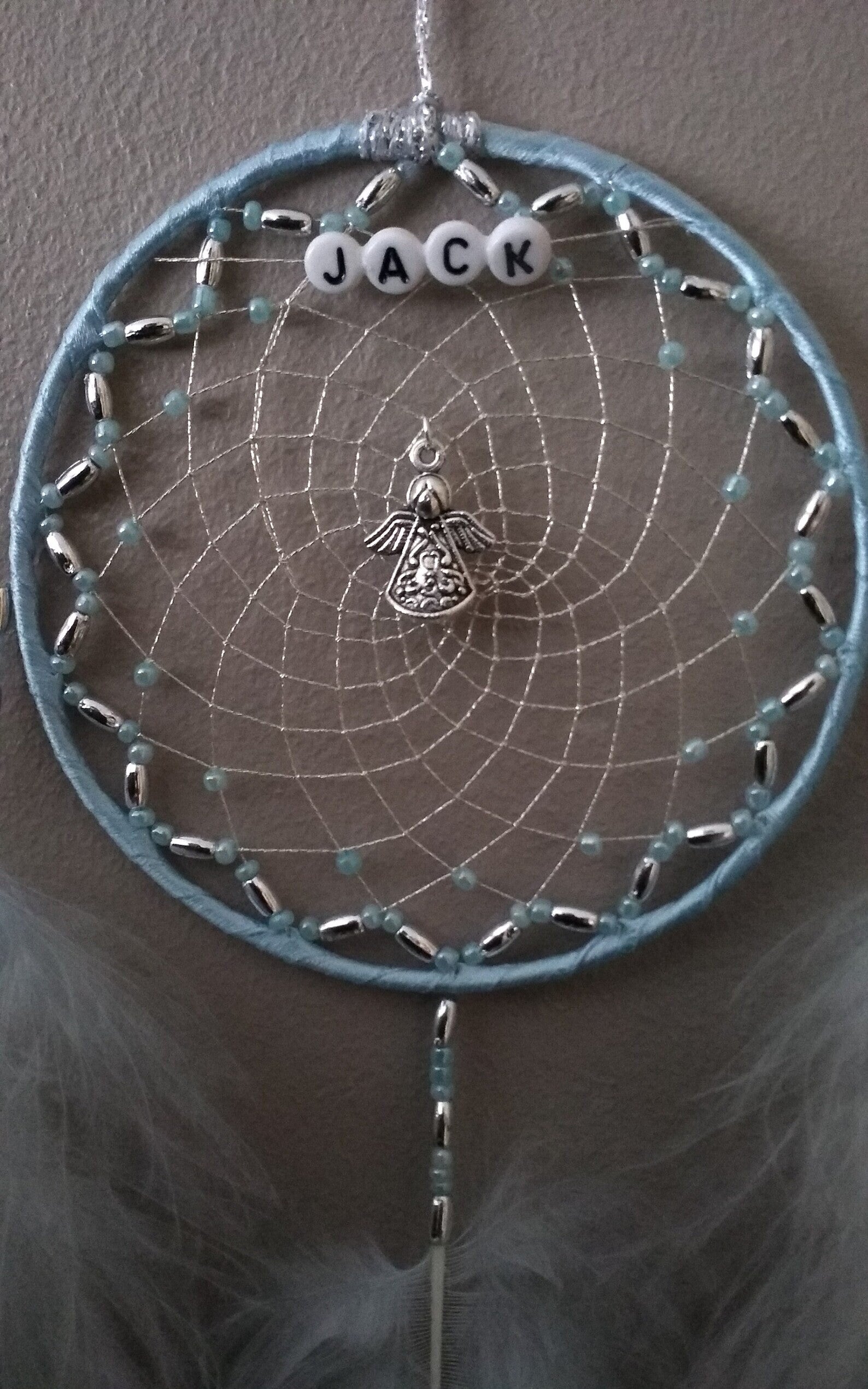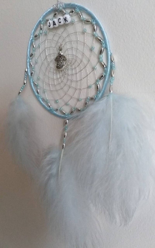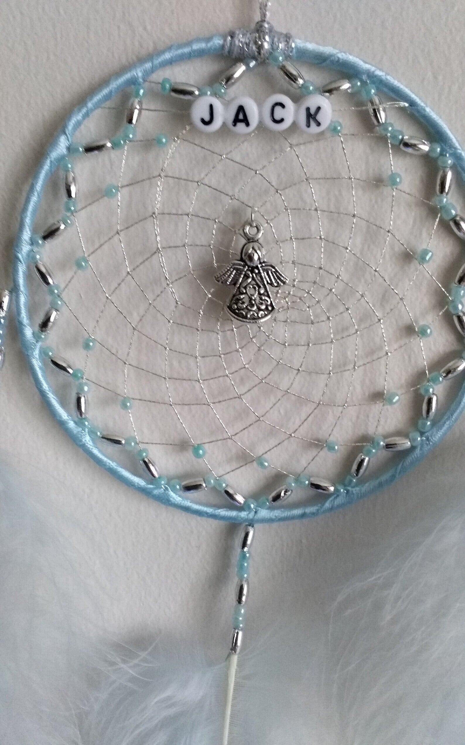 This Pale Baby Blue Guardian Angel Personalised Dreamcatcher has been lovingly hand crafted here in Cornwall UK this dream catcher measures 4" dia. (approx)