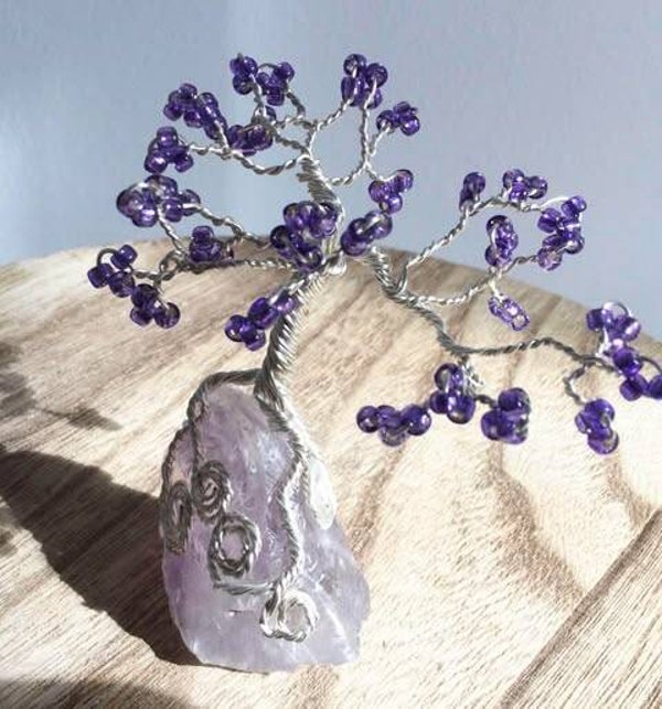 Crafted from silver colour wire and finished with purple beads. The base is a lovely nugget of genuine Amethyt (February Birthstone) Though it was challenging to capture its full brilliance in winter photos, hopefully you will be able to see how pretty this tree is. Its eye-catching charm makes it the perfect gift for Birthdays, Valentine’s Day, or even Mother’s Day Please watch the video below