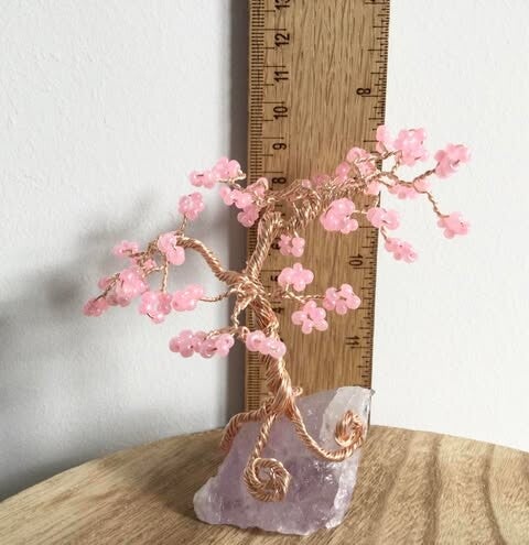 Crafted from wire colour wire and finished with pink beads to look like blossom. The base is a lovely nugget of genuine Amethyst (February Birthstone) Though it was challenging to capture its full brilliance in winter photos, hopefully you will be able to see how pretty this tree is. Its eye-catching charm makes it the perfect gift for Birthdays, Valentine’s Day, or even Mother’s Day Please watch the video below