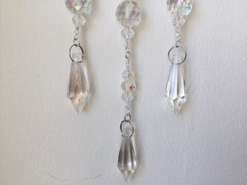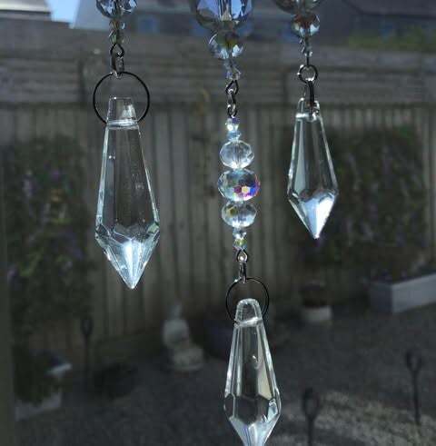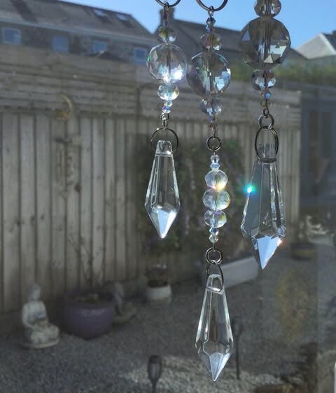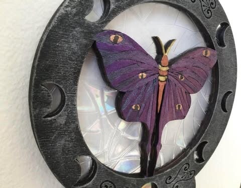 Our Handcrafted Luna Moth Suncatcher is made from 2 pieces of wood which has been hand painted in black and brushed silver, the Luna Moth has been hand painted in sparkly metallic paints that actually appear to change colour as it moves, sandwiched between the front and back is a suncatcher film which actually reflects a rainbow effect, it has been finished with 3 very sparkly dangles each with a teardrop point on the end. This really catches the light well as hopefully you can see from the photo's and video, it reflects multicolour orbs around your room when hung in the right postition.